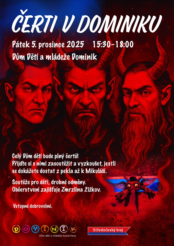 Celý Dům dětí se promění v peklo plné čertů. Čeká vás cesta z pekla Dominiku přes nebe k andílkům až k Mikuláši. Připraveny budou soutěže, odměny, skvělá atmosféra a občerstvení od Zmrzliny Žižkov.