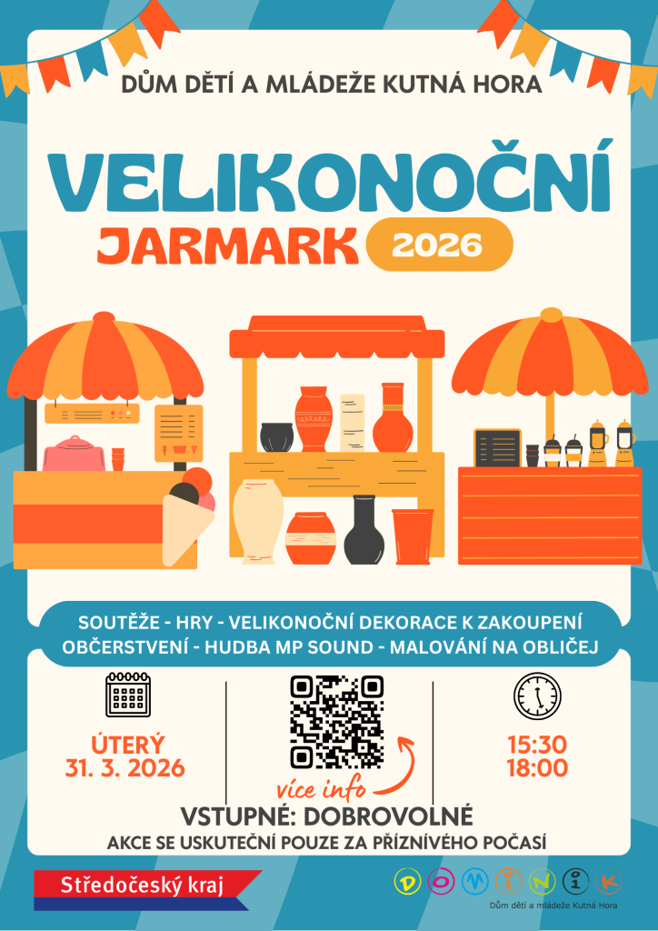 Srdečně vás zveme na Velikonoční jarmark 2026, který se uskuteční v úterý 31. 3. 2026 od 15:30 do 18:00. Těšit se můžete na soutěže, hry, velikonoční dekorace k zakoupení, občerstvení, hudbu i malování na obličej.